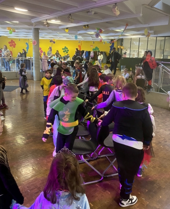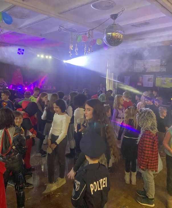 Am Nachmittag ging das bunte Treiben weiter: Die SMV, unterstützt von Herrn Kohler, lud die Grundschulkinder zur traditionellen Faschingsdisco ein. Bei Klassikern wie der „Reise nach Jerusalem“ und dem „Stopptanz“ war Spaß garantiert. Die Kids tanzten ausgelassen zur Musik, die dank der professionellen Anlage der Tontechnik-AG mit Diskobeleuchtung und Nebel für die perfekte Partyatmosphäre sorgte.