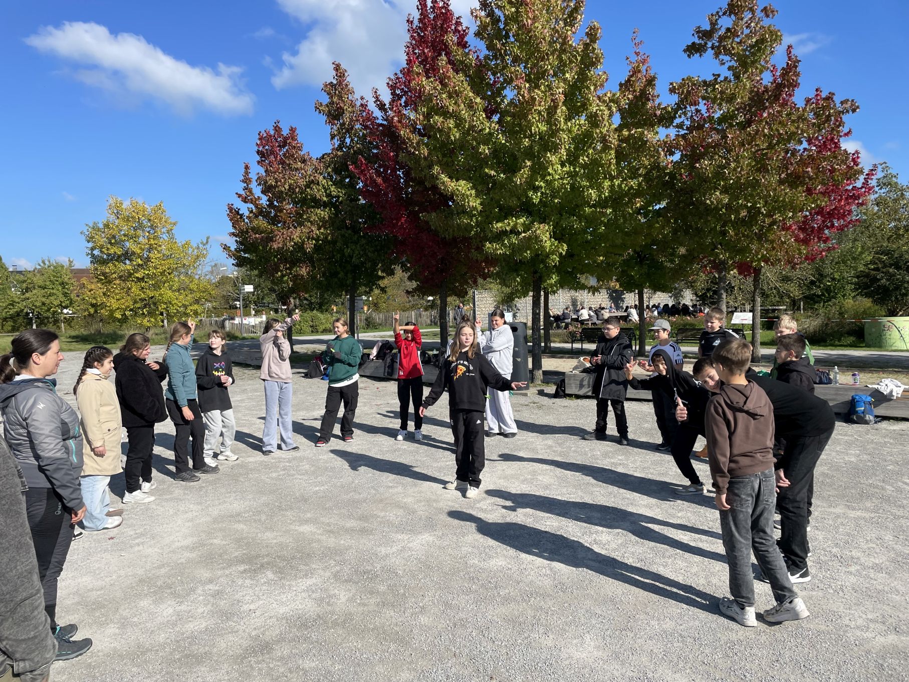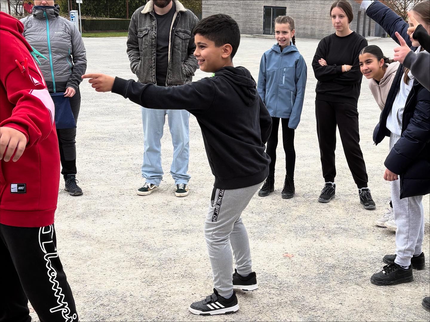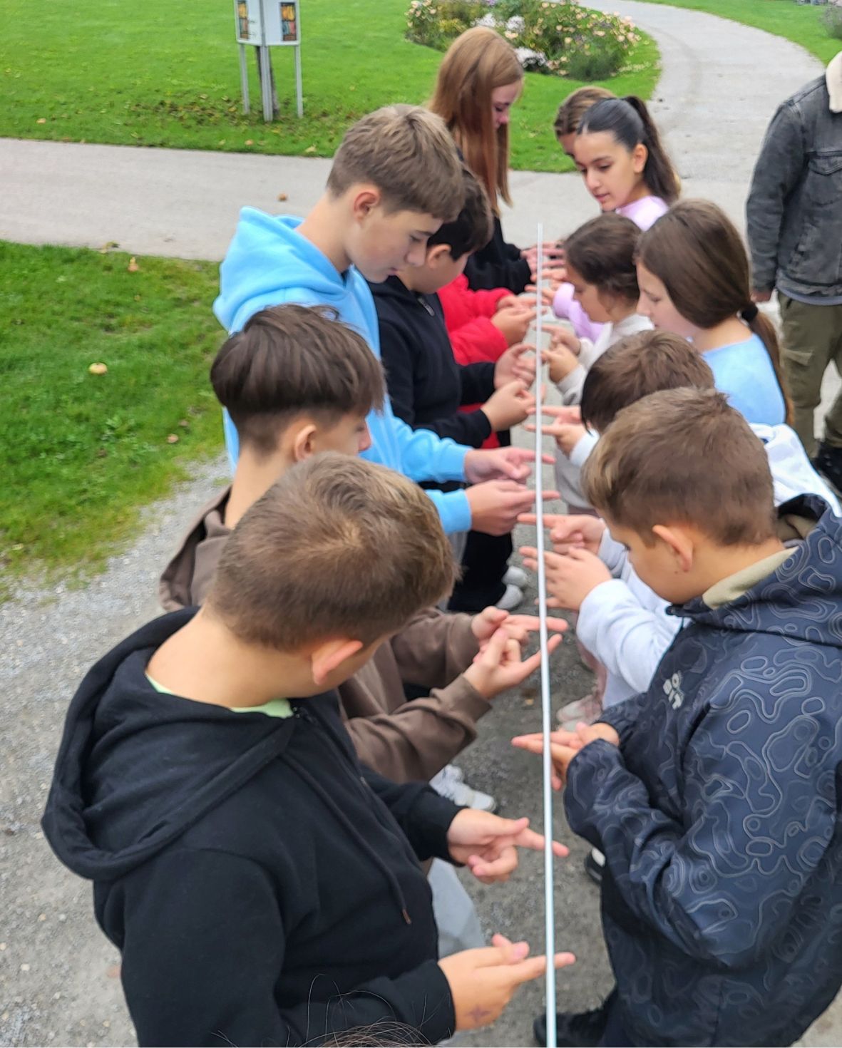 Am Vormittag stand ein Sozialkompetenztraining auf dem Programm, bei dem Teamarbeit, Kommunikation und gegenseitiges Vertrauen im Mittelpunkt standen. In verschiedenen Übungen – etwa beim gemeinsamen Halten eines Stabs, bei einer Ball- und Geschwindigkeitsaufgabe oder beim „Wäscheklammer-Klau“ – konnten die Schülerinnen und Schüler zeigen, wie gut sie zusammenarbeiten und sich gegenseitig unterstützen.