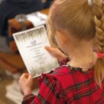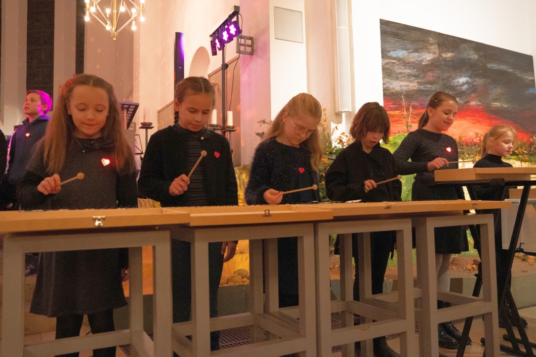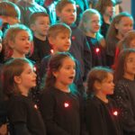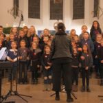 Nun kamen die Kleinsten an die Reihe. Der Grundschulchor unter Leitung von Carolin Schuster eröffnete mit dem klassischen „Schneeflöckchen, Weißröckchen“ und dem nachdenklichen Lied „Was hat wohl der Esel gedacht“. Cool wurde es mit dem Song „Morgen Kinder wird´s was geben“. Nach einer instrumentalen Einleitung von 6 Viertklässlerinnen auf dem Glockenspiel, sorgte die moderne Interpretation für manches Schmunzeln auf den Gesichtern der Gäste. Der Grundschulchor wurde von Mark Wieland am Klavier, Christina Babel an der Querflöte und Mareike Benninger an der Geige begleitet.