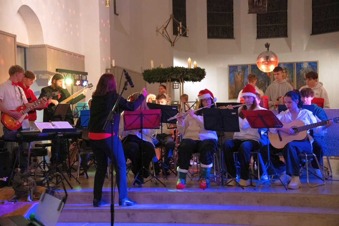 Die Musikklasse R7 von Luca Algaba präsentierte das stimmungsvolle „Merry Xmas Everybody“. Begleitet wurden sie von Schülerinnen und Schülern der R10b an den Ukulelen.