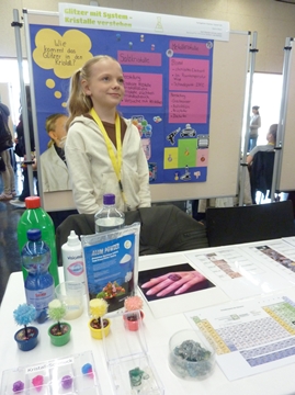 | Katrin Ebert (R7a) ist in die Welt der Kristalle eingetaucht. Die Jury des Bereichs Chemie war von dem Glitzer mit System begeistert und belohnte die Arbeit mit einem Sonderpreis. |