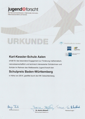 | Für die Teilnahme von 7 Projekten beim Wettbewerb „Jugend forscht“ erhält die KKS den Schulpreis der IHK. |