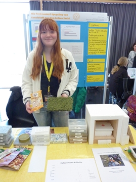 | Viktoria Tönges (R8a) hat sich mit dem Upcycling von Kunststoffen aus dem Gelben Sack beschäftigt. Die Jury des Bereichs Technik war von der Idee begeistert und belohnte die Arbeit mit dem Regionalsieg und einem Sonderpreis. |