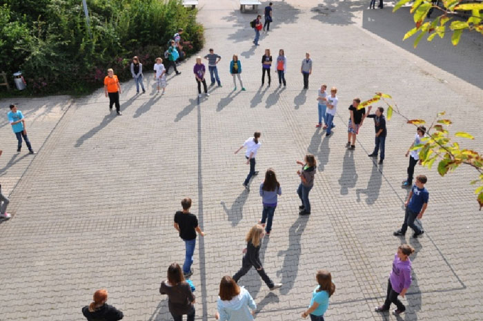 Auf dem Schulhof stehen den Schülerinnen und Schülern Tischtennisplatten, Fußballtore, Basketballkörbe, Sprungspiele, Völkerballfelder, … zur Verfügung.